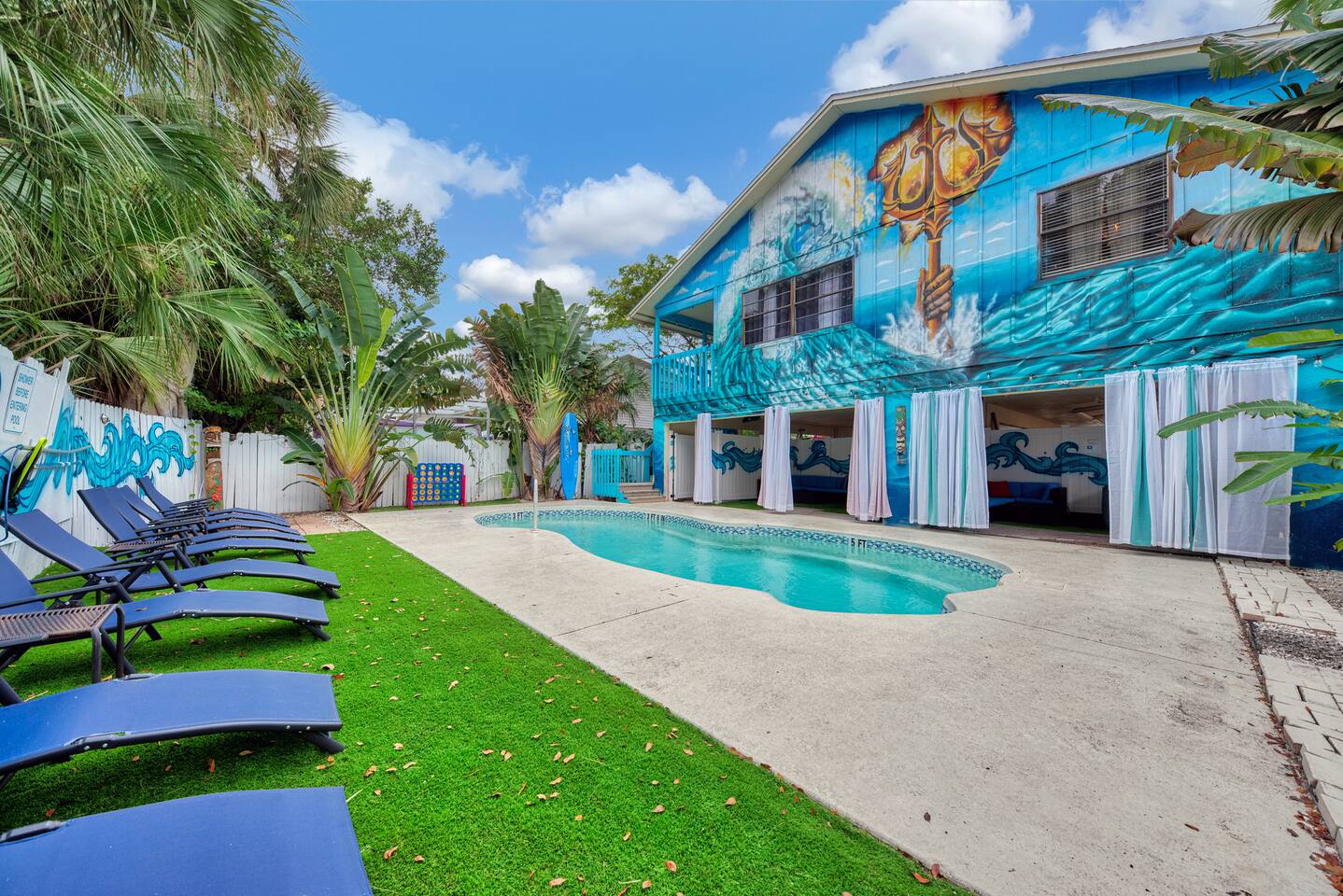 Experience luxury & comfort in this 4BR 3BA Siesta Key duplex, just steps from the beach entrance along iconic Beach Road. This private getaway features trendy interiors, fully equipped kitchens, spacious living areas & a spectacular backyard with a saltwater pool, two cabanas with hot tubs, BBQs & vibrant murals. Perfect for families, groups, & friends seeking fun & relaxation in a prime Gulf Coast location. ☀ Private Pool ☀ Easy Beach Access ☀ BBQ Grill