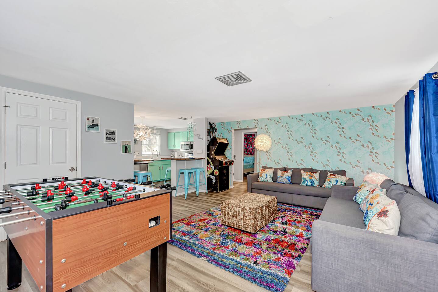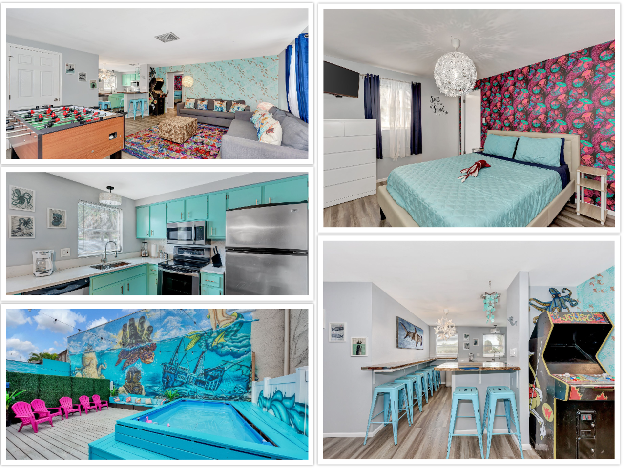 Escape to this vibrant 3BR,Pet friendly Siesta Key retreat, just steps from pristine beaches and the lively Siesta Key Village. Featuring colorful décor, a fully equipped kitchen, and a fun-filled backyard with a splash pool, private tiki hot tub, and mural-perfect photo spots, this home is ideal for families, groups, and beach lovers. Book now for an unforgettable coastal getaway! <b>☀ Private Pool ☀ Private Hot Tub</b> ☀ Easy Beach Access ☀ Gaming Console