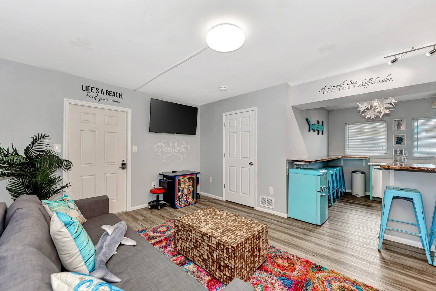 Retreat to the trendy 3BR 2Bath home and experience the laid-back ambiance of the beachfront Siesta Key area. This unique home is nestled just a few steps from the pristine sandy beaches and the vibrant Siesta Key Village, offering a fun getaway close to numerous restaurants, shops, and attractions. <b>✔ Private Luxury Tiki Hot Tub & Splash Pool</b> ✔ 3 Comfortable Bedrooms (Sleeps 12) ✔ Open Design Living ✔ Arcade Table ✔ Full Kitchen ✔ #Instaworthy Mural ✔ Smart TVs ✔ Wi-Fi ✔ Parking
